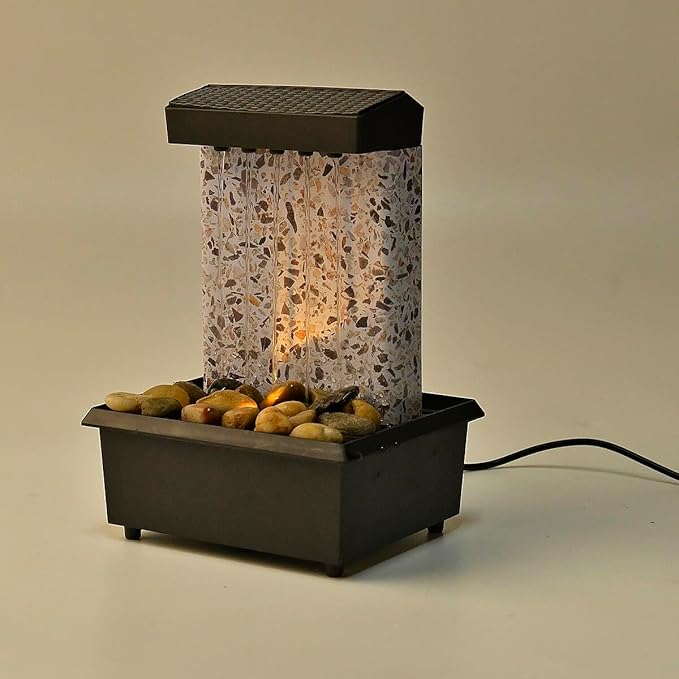 Featuring a sleek rectangular design with natural stone texture and soft LED lighting, this fountain creates a peaceful waterfall effect that enhances any room with calm and elegance.